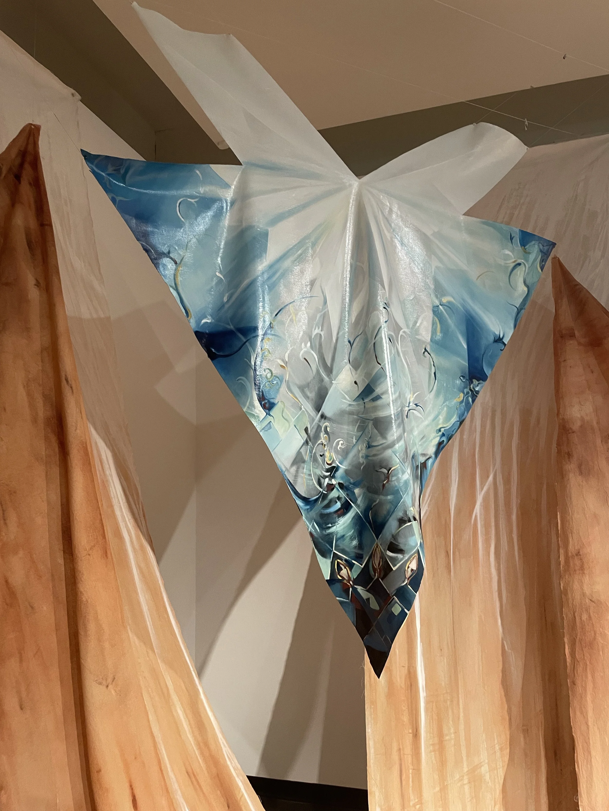 Garment of the Soul captures the fleeting moment of emotional attachment to my motherland, Iran. The installation embodies state of liminality that arises from memories and attachment that span geographical and cultural distances. The work represents my diasporic being drawn from Rumi's poetry, based on the gnostic concept of human existence in three layers that form my painting installation: “Body or Form” appears through Australian red sand and fabric, evoking presence in Australia. The triangular oil painting hanging at the centre represents “Soul or Meaning,” recalling Iranian architectural memories such as blue dome tilework. “Spirit or Unseen” is marked by the V-shaped cut in the background layer.